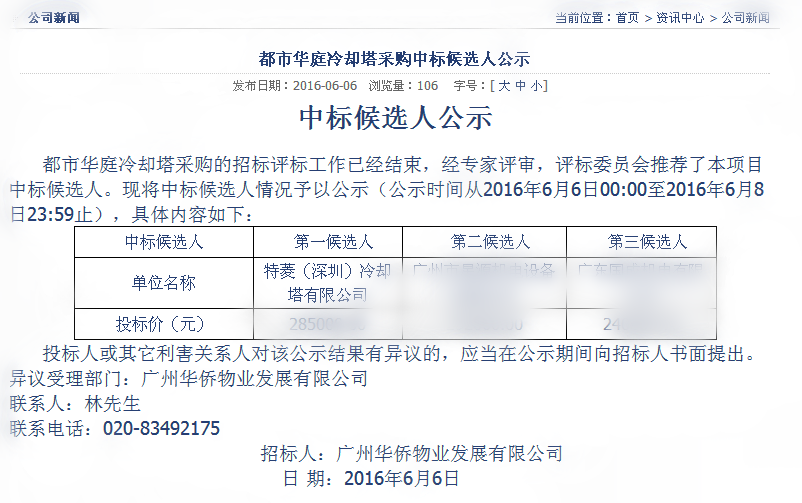 第三方官網(wǎng)公布冷卻塔中標信息: